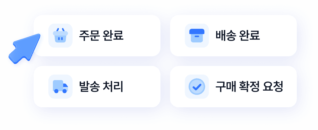 주문, 배송, 구매확정 등 다양한 템플릿을 제공하여 클릭 몇 번으로 간편하게 세팅이 가능해요