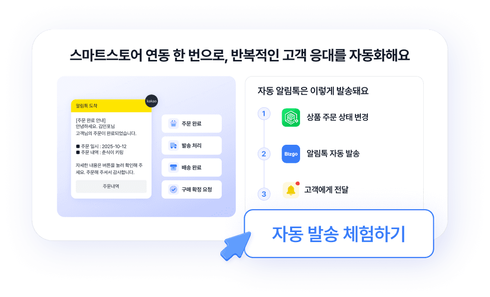 결제, 배송 시작, 배송 완료 등 주문 상태에 맞는 알림톡이 자동으로 발송되어 반복 업무가 사라져요.